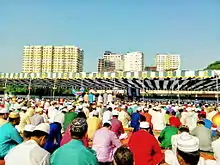 As the most important religious festival for the majority of Muslims, the celebration of Eid ul-Fitr has become a part of the culture of Bangladesh. The government of Bangladesh declares the holiday for three days on Eid-ul Fitr. But practically, all schools, colleges, and offices remain closed for a week. This is the happiest time of the year for most of the people in Bangladesh. All outgoing public transport from the major cities become highly crowded and in many cases the fares tend to rise in spite of government restrictions. On Eid day, the Eid prayers are held all over the country, in open areas like fields, Eidgahs or inside mosques.[2] After the Eid prayers, people return home, visit each other's home and eat sweet dishes called Shirini, Sheer Khurma and other delicacies like biryani, korma, haleem, kebab etc. Throughout the day people embrace each other and exchange greetings. It is also customary for junior members of the society to touch the feet of the seniors, and seniors returning blessings (sometimes with a small sum of money as a gift). Money and food are donated to the poor. In rural areas, the Eid festival is observed with great fanfare. Quiet remote villages become crowded. In some areas, Eid fairs are arranged. Different types of games including boat racing, kabaddi, and other traditional Bangladeshi games, as well as modern games like cricket and football, are played on this occasion. In urban areas, people play music, visit each other's houses, arrange picnics and eat special food. The homes, streets, markets, and parks are illuminated with lighting decorations in the evening. Watching movies and television programs have also become an integral part of the Eid celebration in urban areas. All local TV channels air special program for several days for this occasion.