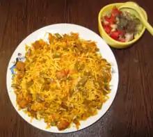 Shirazi salad (Persian: سالاد شیرازی sālād shirāzi) is an Iranian salad that originated from and is named after Shiraz. It is a relatively modern dish, dating to sometime after the introduction of the tomato to Iran at the end of the nineteenth century.[8] Its primary ingredients are cucumber, tomato, onion, olive oil, herbal spices and verjuice, although lime juice is sometimes used in its preparation.[9] Shirazi faloodeh (or Paloodeh) (Persian: پالوده شیرازی, romanized: pālūde Shirāzi) is a special version of Faloodeh from the city of Shiraz, is particularly well-known.[10]