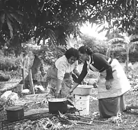 In former times, there was only one main meal, a midday meal cooked in an earth oven. Villagers would rise, eat some leftover food from the previous day's meal, and set out to work in the fields, fishing, gathering shellfish, etc. The results of the morning's work would be cooked by the men, and served to the assembled household. The remnants would be placed in a basket suspended from a tree. This food is served as an end-of-the-day snack as well as the next day's breakfast. Food past its prime was given to the pigs.