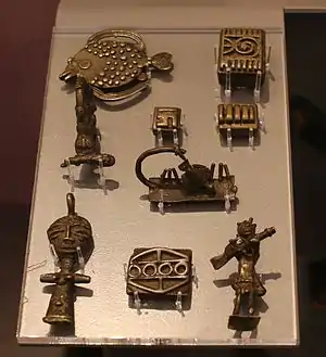 Gold was an fundamental part of Ashanti art. The Ashanti just like all Akan kingdoms, used goldweights called abramo to measure gold dust.[39] Most goldweights are miniature representations of West African cultural items such as the adinkra symbols, plants, animals and people.[40] The earliest weights have been dated from 1400–1700 AD.[41] The weights were carved and cast through the lost wax technique.