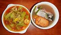 Other popular dishes include afritada, asado, tapa, empanada, mani (roasted peanuts), paksiw (fish or pork, cooked in vinegar and water with some spices like garlic and pepper), pandesal (bread of salt), laing, sisig, torta (omelette), kare-kare (ox-tail stew), kilawen, pinakbet (vegetable stew), pinapaitan, and sinigang (tamarind soup with a variety of pork, fish, or prawns). Some delicacies eaten by some Filipinos may seem unappetizing to the Western palate include balut (boiled egg with a fertilized duckling inside), longganisa (sweet sausage), and dinuguan (soup made from pork blood).