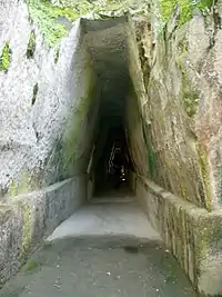 The cave known as the "Antro della Sibilla" was discovered by Amedeo Maiuri in 1932, the identification of which he based on the description by Virgil in the 6th book of the Aeneid, and also on a description by an anonymous author known as pseudo-Justin. (Virg. Aen. 6. 45–99; Ps-Justin, 37). The cave is a trapezoidal passage over 131 m long, running parallel to the side of the hill and cut out of the volcanic tuff stone, and leads to an innermost chamber where the Sibyl was thought to have prophesied.