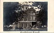 The Cumberland County Courthouse, located in Courthouse Square in Toledo, is the county courthouse of Cumberland County, Illinois. Built in 1887–88, the building is Cumberland County's second courthouse. The first courthouse, located at the same site as the current one, was built in 1856 and burned in 1885. The second courthouse was designed by architects S. S. Goehring and L.L. Pierson. The building's design features a central clock tower, arched entrances on the east and west sides, column-supported balconies above the entrances, and a balustrade along the roofline. The building has continuously served as the seat of county government since its opening.[2]