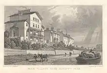 The Regent's Canal was developed as a means of delivering goods into the North of London. It linked the Grand Junction Canal's Paddington Arm with the River Thames at Limehouse.[4] The Cumberland Arm was built as a spur off it and led between Nash's Park Village West and Park Village East to the Cumberland Basin which was lined by a collection of wharfs and warehouses. Hay and straw were brought in for sale at the Market and for the nearby Albany Street cavalry barracks.[5] Barges, each capable of carrying thirty tons, would also arrive with heavy goods such as stone and lime for building; coal and timber for the neighbouring coach-building and furniture trade. Ice, too, was brought in for the ice-merchant, William Leftwich, who had an icehouse that was eighty-two feet deep and with a capacity of 1,500 tons under the Market.[6] Vegetables and cattle were carried in as well, thus reducing the need for the latter to be driven into the city.