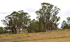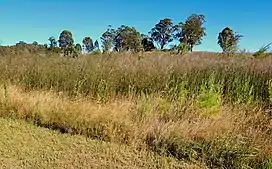 The grassy woodland is dominated by Grey Box (Eucalyptus moluccana) and Forest Red Gum (E. tereticornis), with Narrow-leaved Ironbark (Eucalyptus crebra), Spotted Gum (Corymbia maculata) and Thin-leaved Stringybark (Eucalyptus eugenioides) occurring sporadically. The ecoregion may have an open layer of small trees that would include such species of Acacia decurrens, Acacia parramattensis, Acacia implexa and Exocarpos cupressiformis.[24] The shrub layer is mainly contains Bursaria spinosa, indigofera australis, Hardenbergia violacea, Daviesia ulicifolia, Lespedeza cuneata, Dillwynia, Dodonaea viscosa, with plenty grasses such as Kangaroo Grass (Themeda australis) and Weeping Meadow Grass (Microlaena stipoides).[25]