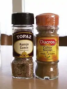 Cumin was a significant spice for the Minoans in ancient Crete. Ideograms for cumin appear in Linear A archive tablets documenting Minoan palace stores during the Late Minoan period.[17] The ancient Greeks kept cumin at the dining table in its own container (much as pepper is frequently kept today), and this practice continues in Morocco. Cumin was also used heavily in ancient Roman cuisine.[18] In India, it has been used for millennia as a traditional ingredient in innumerable recipes, and forms the basis of many other spice blends.[8]