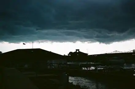 In the updraught area, the air has a negative buoyancy and is sucked up by a low pressure zone at altitude. Turbulence is annihilated.[10] In particular, in the forward area of the supercell, one can find a flanking line made of cumulus congestus or small cumulonimbus. The cloud base of the flanking line is higher than the base of the main cumulonimbus.