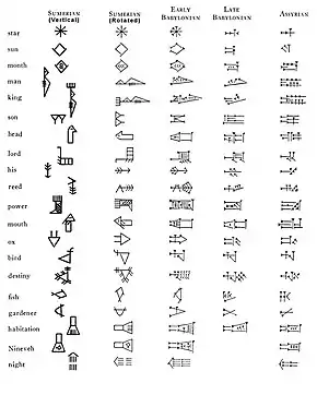 Table illustrating the progressive simplification of cuneiform signs from archaic (vertical) script to Assyrian