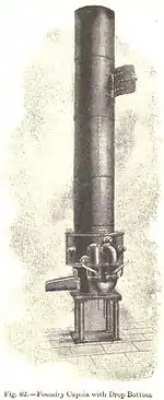 A cupola or cupola furnace is a melting device used in foundries that can be used to melt cast iron, Ni-resist iron and some bronzes. The cupola can be made almost any practical size. The size of a cupola is expressed in diameters and can range from 1.5 to 13 feet (0.5 to 4.0 m).[1] The overall shape is cylindrical and the equipment is arranged vertically, usually supported by four legs. The overall look is similar to a large smokestack.