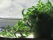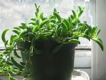 Curio radicans,[1] syn. Senecio radicans, is a succulent houseplant that is native to South Africa. A member of the family Asteraceae, the asters, this species is closely related to the common string of pearls and Curio hallianus. It has multiple tendrils of glossy, banana-shaped foliage. It is commonly known as string of bananas or fishhook senecio.