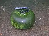In the early history of curling, the playing stones were simply flat-bottomed stones from rivers or fields, which lacked a handle and were of inconsistent size, shape, and smoothness.[14][15] Some early stones had holes for a finger and the thumb, akin to ten-pin bowling balls.[16] Unlike today, the thrower had little control over the 'curl' or velocity and relied more on luck than on precision, skill, and strategy. The sport was often played on frozen rivers although purpose-built ponds were later created in many Scottish towns.[17] For example, the Scottish poet David Gray describes whisky-drinking curlers on the Luggie Water at Kirkintilloch.[18][19]