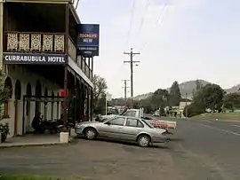 The Indigenous Kamilaroi people lived in the area for many thousands of years.[3] Originally known as "Carrobobella" which comes from the Kamilaroi language, the name was then changed with the arrival of white settlers. Before 1848 there was an 'accommodation house' at Currabubula and by 1854 (or even possibly earlier) there was an inn located at Carabobbela. The village was laid out before 1860 and in 1862 Currabubula was shown on the county map.[4] A railway station on the Main North railway line was located there between 1878 and 1985.[5]