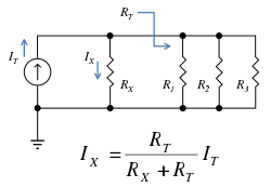 In electronics, a current divider is a simple linear circuit that produces an output current (IX) that is a fraction of its input current (IT). Current division refers to the splitting of current between the branches of the divider. The currents in the various branches of such a circuit will always divide in such a way as to minimize the total energy expended.