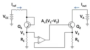 - An idealized version of the argument in the text, valid for infinite op amp gain, is as follows. If the op amp is replaced by a nullor, voltage V2 = V1, so the currents in the leg resistors are held at the same value. That means the emitter currents of the transistors are the same. If the VCB of Q2 increases, so does the output transistor β because of the Early effect: β = β0(1 + VCB / VA). Consequently the base current to Q2 given by IB = IE / (β + 1) decreases and the output current Iout = IE / (1 + 1 / β) increases slightly because β increases slightly. Doing the math,