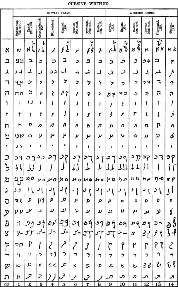 This table shows the development of cursive Hebrew from the 7th through the 19th centuries. This is discussed in the following section, which makes reference to the columns in the table, numbered 1 through 14.
