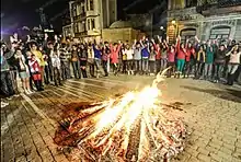 At night, everyone should jump over a bonfire 7 times while telling a special phrase. After holiday people visit adults and elder people to congratulate their holiday and the elderly will often give gifts to the younger. And people who quarreled got reconciled on that day.[8][9][10]