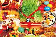 Azerbaijanis start holiday 4 Wednesdays before 21st of March which is the symbol of winter's end and the coming of the New year. They are called Water Wednesday, Fire Wednesday, Earth Wednesday, Wind or Last Wednesday.[6] Nowruz holiday consists of ceremonies and traditions. People start to clean house, paint eggs, sprout up semeni, make national pastries such as shekerbura, pakhlava, shorgoghal, badambura and a great variety of national cuisine.[7] It is tradition to light a candle matching the number of family members. One of the main attributes of Nowruz is egg. Many nations considered that the egg is a symbol of life. Each egg colour has its own meaning. Egg painted Red color - summer, Green Color – Spring, Yellow Color- autumn, Non-color egg means winter.