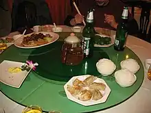 There appears to be no Chinese word for communal eating and using one's personal chopsticks in the serving dish. However, at some formal meals, there may be pairs of communal serving chopsticks (公筷, gongkuai).[13] These are sets of chopsticks specifically for shared dishes only. Often, these will be distinct from the putongkuai (普通筷, regular chopsticks) or sikuai (私筷, personal chopsticks) in that they will be longer and more ornate.
