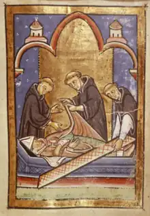 In 1104 Cuthbert's tomb was opened again and his relics translated to a new shrine behind the altar of the recently completed Cathedral. When the casket was opened, a small book of the Gospel of John, measuring 138 by 92 millimetres (5.4 × 3.6 inches), now known as the Saint Cuthbert Gospel (now British Library Additional MS 89000, formerly known as the Stonyhurst Gospel), was found. This is the oldest Western book to have retained its original bookbinding, in finely decorated leather.[37] Also recovered much later were a set of vestments of 909–916, made of Byzantine silk with a "Nature Goddess" pattern, with a stole and decoration in extremely rare Anglo-Saxon embroidery or opus anglicanum, which had been deposited in his tomb by King Æthelstan (r. 927–939) on a pilgrimage while Cuthbert's shrine was at Chester-le-Street.[38][39]