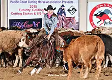 A cutting horse is said to possess an innate ability to anticipate or read a cow's intended moves; an ability commonly referred to as having cow sense or cow smarts.[2] Competitive cutting horses are well-trained and conditioned athletes with skills honed to constrain the movement of a cow and prevent it from returning to the herd. Such horses are able to stop and turn instantaneously, in sync with a cow's every move. The harder a cow tries to get back the herd, the more instinct, skill and athleticism are required of the horse to stay head to head with the cow, and the higher the competition score. A common analogy is a basketball point guard holding off a defender.[3] American Quarter Horses and other horse breeds with Quarter Horse ancestry, such as American Paint Horses are the most popular choices for the sport, although other breeds with stock horse type are also used, particularly in breed-specific competition.