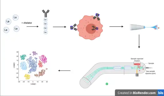 CyTOF takes advantage of immunolabeling to quantify proteins, carbohydrates or lipids in a cell. Targets are selected to answer a specific research question and are labeled with lanthanide metal tagged antibodies. Labeled cells are nebulized and mixed with heated argon gas to dry the cell containing particles. The sample-gas mixture is focused and ignited with an argon plasma torch. This breaks the cells into their individual atoms and creates an ion cloud. Abundant low weight ions generated from environmental air and biological molecules are removed using a quadrupole mass analyzer. The remaining heavy ions from the antibody tags are quantified by Time-of-flight mass spectrometry.[1] Ion abundances correlate with the amount of target per cell and can be used to infer cellular qualities.[2]