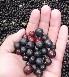 The fruit is a berry 5–16 mm (3⁄16–5⁄8 in) in diameter with a flared crown at the end; they are pale greenish at first, then reddish-purple, and finally uniformly blue when ripe.[8] They are covered in a protective coating of powdery epicuticular wax, colloquially known as the "bloom".[7] They generally have a sweet taste when mature, with variable acidity.[7][8] Blueberry bushes typically bear fruit in the middle of the growing season: fruiting times are affected by local conditions such as climate, altitude and latitude, so the time of harvest in the northern hemisphere can vary from May to August.[7][8]