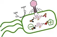 Cyanophage replication has two dominant cycles: the lytic cycle and the lysogenic cycle. Viral nucleic-acid replication and immediate synthesis of virus-encoded protein is considered to be the lytic cycle. Phages are considered lytic if they only have the capacity to enter the lytic cycle; whereas, temperate phage can either enter the lytic cycle or become stably integrated with the host genome and enter the lysogenic cycle.[26] To meet the metabolic demand of replication, viruses recruit a multitude of strategies to sequester nutrients from their host. One such technique is to starve their host cell. This is done by inhibiting the host cells CO2 fixation, which enables the cyanophage to recruit photosynthetically formed redox and ATP from the host cell to meet their nucleotide and metabolic response.[27] Many cyanophages contain genes known as viral-encoded auxiliary metabolic genes (AMGs), which encode critical, rate-limiting steps of the host organism.[27] AMGs encode genes for the pentose phosphate pathway, phosphate acquisition, sulfur metabolism, and DNA/RNA processing; these genes interfere with the metabolism of the host cell. Metagenomic analysis highly supports the notion that these genes promote viral replication through the degradation of host DNA and RNA, as well as a shift in host-cell metabolism to nucleotide biosynthesis.[27] Cyanophages also use these genes to maintain host photosynthesis through the progression of the infection, shuttling the energy away from carbon fixation to anabolism, which the virus takes advantage of.[28] AMGs also code for proteins, which aid in the repair of the host photosystem, which is susceptible to photodegradation.[28] One such example is the D1 proteins which replace the host cells D1 protein when it becomes damaged.[28] The virus up-regulates photosynthesis, which leads to an increased rate of D1 protein degradation, the host cell alone can not efficiently replace these proteins so the cyanophage replaces them for the host cell, allowing it to continue providing energy for the cyanophage replication cycle.[28]