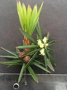 Leaves: Dark green, linear and pointed 2โ4 cm long. They have parallel venation and form false whorls, particularly towards the end of the stem. Undersides are distinctively glaucous.[3]
