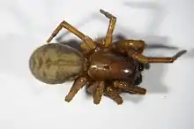 Callobius claustrarius is a species of spider in the family Amaurobiidae. Males of the species reach 8 mm, females about 11 mm. Head and legs are reddish brown, the abdomen is dark grey with an extended brown surface, dotted with lighter brown specks.