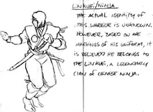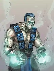 Sub-Zero has Ice powers and was first conceived by Mortal Kombat co-creator John Tobias as a mysterious character named simply "Ninja".[37] According to Richard Divizio, the Lin Kuei idea was his input back at the very beginning of the development, in the project that had been cancelled by Midway Games before being restarted later, and in which "originally John [Tobias] had Japanese ninjas".[38] Tobias wrote this inspiration came from the controversial book China's Ninja Connection by Li Hsing, which "posits historical evidence for the existence of the Lin Kuei and their influence on the Japanese ninja.[39][40] I was aware of there being some controversy about the author’s claims. So when we split the character in two for palette swaps,[41] I thought it would be fitting that one was of Chinese origin and the other Japanese to kind of embody the argument."[42] According to Tobias, the original "Hunter&Hunted concept was going [to be] about a ninja escaping from his clan and hunted by another member. We used that later for SZ in MK3."[43] Daniel Pesina recalled Tobias' idea involved two ninja brothers, one of whom "wants to lead the clan, so he kills the father who is their teacher".[38] Sub-Zero's early name had been Tundra,[44] but it was changed after a member of the design team saw the 1987 film The Running Man in which the first assassin fought by Arnold Schwarzenegger's character used the name (albeit not hyphenated).