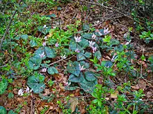 Leaf - Heart-shaped, cordate leaves, often coarsely toothed, of dark-green color with a red-purple back. Cloudy or netted silvery markings can be seen on the leaf.[2]