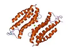The N-terminal domain has an all-alpha structure consisting of six helices in a bundle with a left-handed twist and an up-and-down topology.[12]