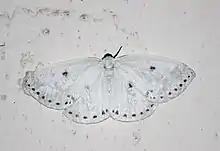 Adults are white, the wings without any transverse markings. The forewings have a discal spot below and the hindwings have a large black spot at the end of the cell. Both wings have a submarginal row of prominent round black spots and a row of indistinct black dots between it and the margin.[3]