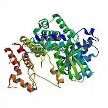 ![]() Crystal structure of human cyclin D1 (blue/green) in complex with cyclin-dependent kinase 4 (yellow/red).[1] | |||||||