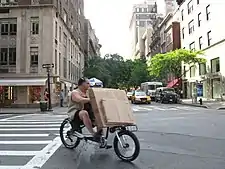 Delivery bikes are commonly used in New York for fast food deliveries over short distances, sometimes using mountain bikes outfitted with a wide carrier for larger loads such as pizza, or other accessories. Electric bicycles are increasingly used for this service; the bikes were initially illegal (although enforcement was sporadic), but legalized in 2020.[18] Proposals in the New York State Legislature in 2015 would define, legalize and regulate certain "electric assist bicycles" with small electric motors.[19]