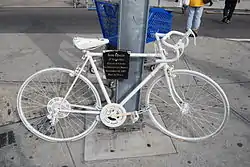 When mayor Bill de Blasio entered office in 2014, he sought to bring all traffic fatalities to zero through his Vision Zero initiative.[82] In 2017, 24 cyclists were killed, and 4,485 were injured in crashes in New York City.[83] Private parties have made maps of fatal accidents, and some fatality locations are marked by white-painted ghost bikes.[84] Although crash-related injuries to cyclists are not uncommon, their incidence has decreased even as the number of cyclists in New York City has increased. Between 2011 and 2015 there were 12.8 cyclist fatalities per 100 million cycling trips, compared with 44.2 cyclist fatalities per 100 million cycling trips between 1996 and 2000.[85]
