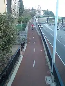 The Perth Principal Shared Path (PSP) network is a web of off-road paths that form the backbone of the Perth Bicycle Network.[4] PSPs are shared pedestrian and bicycle paths that primarily follow freeway and rail corridors, they have a high degree of separation from traffic utilising bridges and tunnels to bypass intersections. The PSP network is constructed according to the Western Australian Department of Main Roads Standards and Guidelines for Shared Paths.[5]