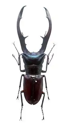 Cyclommatus metallifer is a species of stag beetle in the family Lucanidae.[1] There is sexual dimorphism within the species. Males are generally larger in size and have enlarged mandibles. It is named for its metallic coloration, which ranges in color and may be varying levels of black, brown, or gold.[2] This species is notably easy to maintain, making it a useful species for scientific study.[3] Additionally, it has been kept as an exotic pet.