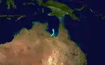By 9 February a monsoon low had formed inland about 220 kilometers southwest of Darwin. This system drifted eastward over land, reaching the shoreline on the Gulf of Carpentaria on 13 February. TCWC Darwin anticipated tropical cyclone development for the system, and had issued Tropical Cyclone Advices for this system on the 12th and 13th. However, development failed to materialize.[20] The monsoon low in conjunction with the active trough over Northern Territory produced floods in several of the area's river systems. Major flooding in the Wickham River tributary caused moderate flooding in the Victoria River. The Waterhouse River began rising on the 12th, forcing 500 people to evacuate. Katherine was threatened, but did not flood when the Katherine River rose to a peak of 17.03 metres on the 14th.[29]