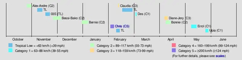 Bernie30 December – 6 JanuaryCategory 2 tropical cyclone95 km/h (60 mph)980 hPa (28.94 inHg)Northern TerritoryUnknownUnknown[31]