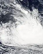 In the beginning of March, the monsoon was active to the northeast of Madagascar, the first time during the season that such active convection persisted northeast of the island. The broad system had two foci of low pressure; one was located northeast of Madagascar near St. Brandon, and the other was to its south closer to Réunion. The structure resembled a monsoon depression, but as the two low-pressure areas consolidated, they became more distinct. On March 2, the system that would become Diwa originated out of the southern low, and both systems continued to interact until Diwa absorbed the other disturbance. The wind field was large and asymmetrical, ranging 2,000 km (1,200 mi) in diameter, and there was little convection near the centers.[3] Despite the lack of organization, the Meteorological Service of Mauritius named the system Tropical Storm Diwa on March 3 due to the threat to the Mascarene Islands, as well as the presence of gale-force winds. The structure slowly evolved into that of a tropical cyclone as the convection concentrated. On March 4, Diwa passed northwest of Réunion, still disorganized with much of the convection to the south.[3] That day, the JTWC initiated advisories on the system as Tropical Cyclone 16S. The storm continued slowly to the southwest at first, until it turned to the southeast on March 6 while rounding the ridge.[16] Despite accelerating into an area of cooler waters, Diwa's structure became much more like a tropical cyclone on March 8.[3] The MFR estimated peak 10 minute winds of 110 km/h (68 mph),[17] making it a severe tropical storm,[3] and the JTWC estimated peak 1 minute winds of 100 km/h (62 mph).[17] Diwa quickly transitioned into an extratropical cyclone as it interacted with a cold front to the south,[16] completing the transition by March 9. The circulation gradually lost its definition, dissipating on March 11.[17][3]