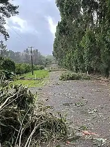 In Taranaki, surface flooding forced road closures on state highways 45 and 1. Multiple households across the region were affected by power outages in Hāwera and New Plymouth.[22] A vaccination clinic in Hāwera was closed due to a power outage. A large pōhutukawa tree fell and blocked a highway south of Ōakura, taking 15 to 20 people to clear the road. High volumes of emergency calls overwhelmed volunteer first responders in South Taranaki; crews were sent from New Plymouth to relieve these volunteers from work. A cowshed in South Taranaki was flooded by the storm. The lee breakwater at Port Taranaki was shut down to the public, however, crowds still gathered nearby to view large swells. Rocks and other debris were scattered across a parking lot in the area and minor damage was reported to jetties and boat ramps.[26] A wave tower at Port Taranaki was left unrepairable after the cyclone and a 164 ft (50 m) exclusion zone was placed around the structure in order to create a safe zone for demolition.[27] In Piha, plastic cladding was shredded at a major construction site.[22] At the peak of the cyclone, over 50,000 customers lost electricity across the Auckland Region. Local emergency agencies received 300 reports of fallen trees, 240 of which had been attended to by 14 February. A total of 12 crews were deployed to responds to major storm-related incidents such as blocked roads and those involving vehicles and homes.[28] A wind gust of 108 mph (174 km/h) was observed on Great Barrier Island during the cyclone.[29] Several COVID-19 testing sites were either moved indoors or closed, the Auckland Zoo ceased operations, and ferries were cancelled for roughly an hour.[30] Several boats in Russell and Opua of the Northland Region were broken free from their moorings. Police in the region received 35 calls of incidents; trees were downed which damaged homes in Kauri and Whangārei. More than 5,000 customers lost electricity in the area due to Dovi.[22]