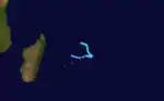 About a month after the previous storm dissipated, the JTWC classified another tropical depression on October 11 about 960 km (600 mi) east-southeast of Seychelles. The system tracked west-southwestward, and the MFR also began issuing warnings on it as Tropical Depression A2 on October 14. Two days later, the JTWC briefly upgraded the depression to a tropical storm, although MFR only estimated peak 10‑minute winds of 50 km/h (30 mph). By that time, the storm had turned to the west, passing north of the northern tip of Madagascar. After turning to the west-northwest, the depression dissipated on October 22.[23] While the depression was active, the MFR also briefly tracked another tropical depression to its northeast, which formed on October 16 about 540 km (345 mi) south-southeast of Diego Garcia. Classified as Tropical Depression A3 by MFR, the depression tracked to the west-southwest, turned to the southeast, and resumed its westward trajectory for several days before dissipating on October 22.[24]