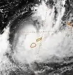 On March 11, the FMS started to monitor a shallow depression, that had developed along the monsoon trough near Rotuma.[22] Over the next two days the depression remained near Rotuma with no preferred movement, as it started to develop further within favourable conditions for further development.[22][23] During March 13, the JTWC subsequently initiated advisories on the system and designated it as Tropical Cyclone 33P.[24] During that day the system continued its northwards movement until it curved eastwards and later south-eastwards during March 14, before it passed about 55 km (35 mi) to the southeast of Niulakita the southernmost island of Tuvalu.[22] Early on March 15, after the system had passed near Niulakita, the FMS reported that the depression had developed into a category 1 tropical cyclone and named it Hina.[22] After being named the system accelerated towards the south-southeast and an area of increasing vertical wind shear, as it passed near the west coast of Futuna Island.[22] The system also crossed the 180th meridian during that day, which prompted the JTWC to pass the responsibility for warning the United States Government to the NPMOC.[25][26]