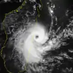 After passing north of Réunion, Edwige began reintensifying due to decreasing wind shear,[1] and the JTWC reissued advisories on February 25.[3] With warm waters, the storm developed increasing outflow as well as an eye.[1] On February 26, Edwige intensified into a tropical cyclone and reached peak 10‑minute winds of 150 km/h (95 mph) while approaching eastern Madagascar. On the same day, the JTWC estimated peak 1‑minute winds of 175 km/h (110 mph).[20] For unknown reasons, Edwige executed a counterclockwise loop along the Malagasy coast near Mananjary. Due to land interaction, the cyclone rapidly weakened and turned to the north-northeast off the coast,[1] although the JTWC assessed the storm as turning inland again.[20] On February 29, Edwige dissipated just off the coast of Toamasina. The storm dropped 369 mm (14.5 in) of rainfall in Mananjary, with wind gusts of 200 km/h (125 mph), but damage was limited.[1]