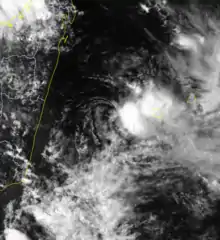 In early May, a westerly wind burst associated with the Madden–Julian oscillation produced disturbances on both sides of the equator in the eastern Indian Ocean.[3] The BoM estimated that a tropical low formed west of Sumatra at the low latitude of 4.8° S,[28][29] near the boundary between the Australian and the south-west Indian basins; this caused difficulty with regard to tropical cyclone warnings.[1] On May 3, the JTWC upgraded the system to tropical storm status.[29] On the next day, the low crossed into the south-west Indian Ocean,[29] intensifying into Tropical Storm Jenna. The MFR estimated peak 10‑minute winds of 85 km/h (55 mph) on May 5. Soon after, an approaching trough turned the storm to the southeast, bringing Jenna back into the Australian region, and absorbing the storm on May 6.[1][29]