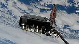 ![]() Cygnus S.S. Sally Ride after arrival at the ISS, with solar panels damaged. | |