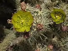 This plant grows in an erect habit up to 3 meters tall. The terminal segments of the stem are generally 16 to 40 cm long, 1.7 to 4 cm in diameter and firmly attached, with tubercles 16 to 35 mm large and less than 7 mm high. The spines are generally less than 3.5 cm long, colored yellow to orange-brown, with the sheath translucent white to gold-brown.[2] The flowers are yellow, often tinged with red tips. The filaments are colored green or yellow, while the stigma is cream to yellow. The green to yellow fruits are a leathery to dry texture, and have few to no spines.[3]