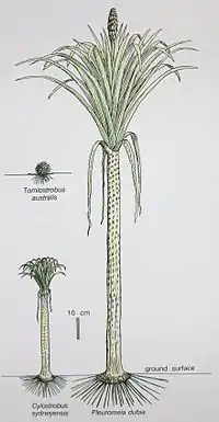Cylostrobus is genus of Lycopsida most like Pleuromeia, but with very compact and round cones. It is known from the Early Triassic of Australia, coincident with a marked greenhouse spike at the end of the Early Triassic.[2] The genus Cylostrobus was erected for the compact cone only, in the paleobotanical system of form genera, but these small plants are well enough understood that the name Cylostrobus sydneyensis is used for the whole plant, rather than the old name Pleuromeia longicaulis. Other species of Pleuromeia have attached cones that are less compact and produce different spores.