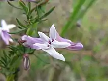 Cyphia is a genus of flowering plants in the bellflower family, native to Africa; and particularly South Africa.[1][2][3] It has been placed in its own subfamily, Cyphioideae.[4] It is closely related to the genus Lobelia.[3] Cyphia comes in shades of white to mauve, whereas lobelias have strong colours of blue to purple.[3] Species in this genus have a bilabiate corolla; with 3 lobes on top and 2 below (as opposed to Lobelia, which has 2 lobes on top and 3 below).[3]